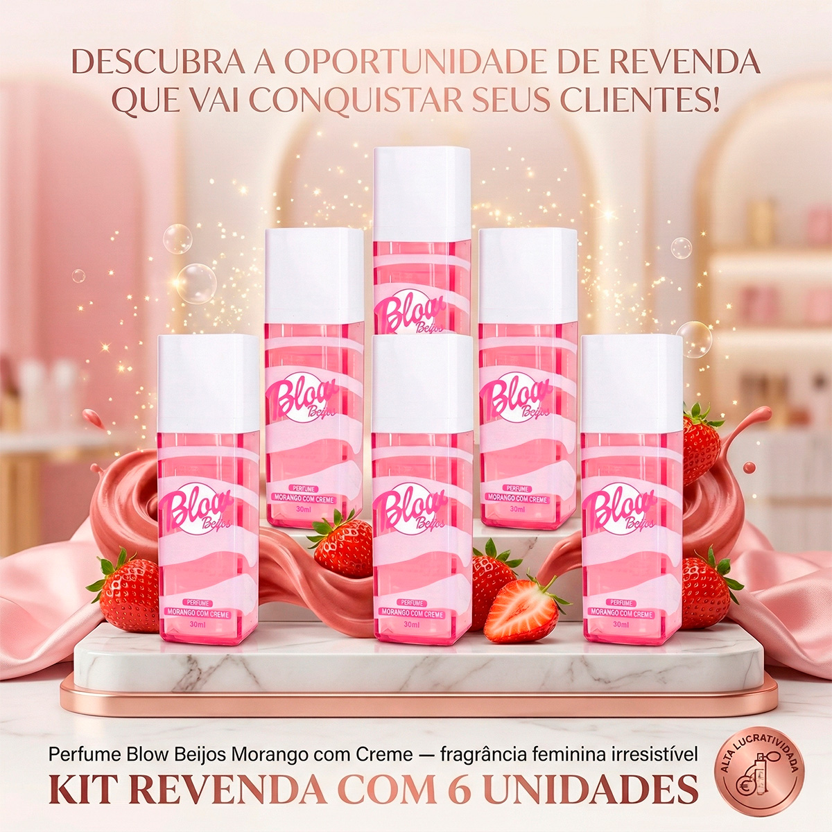 As mulheres buscam "o cheiro das blogueiras" para marcar presença. O Perfume Blow Beijos entrega essa experiência VIP sem cobrar o preço de um importado. A cliente compra pela exclusividade.